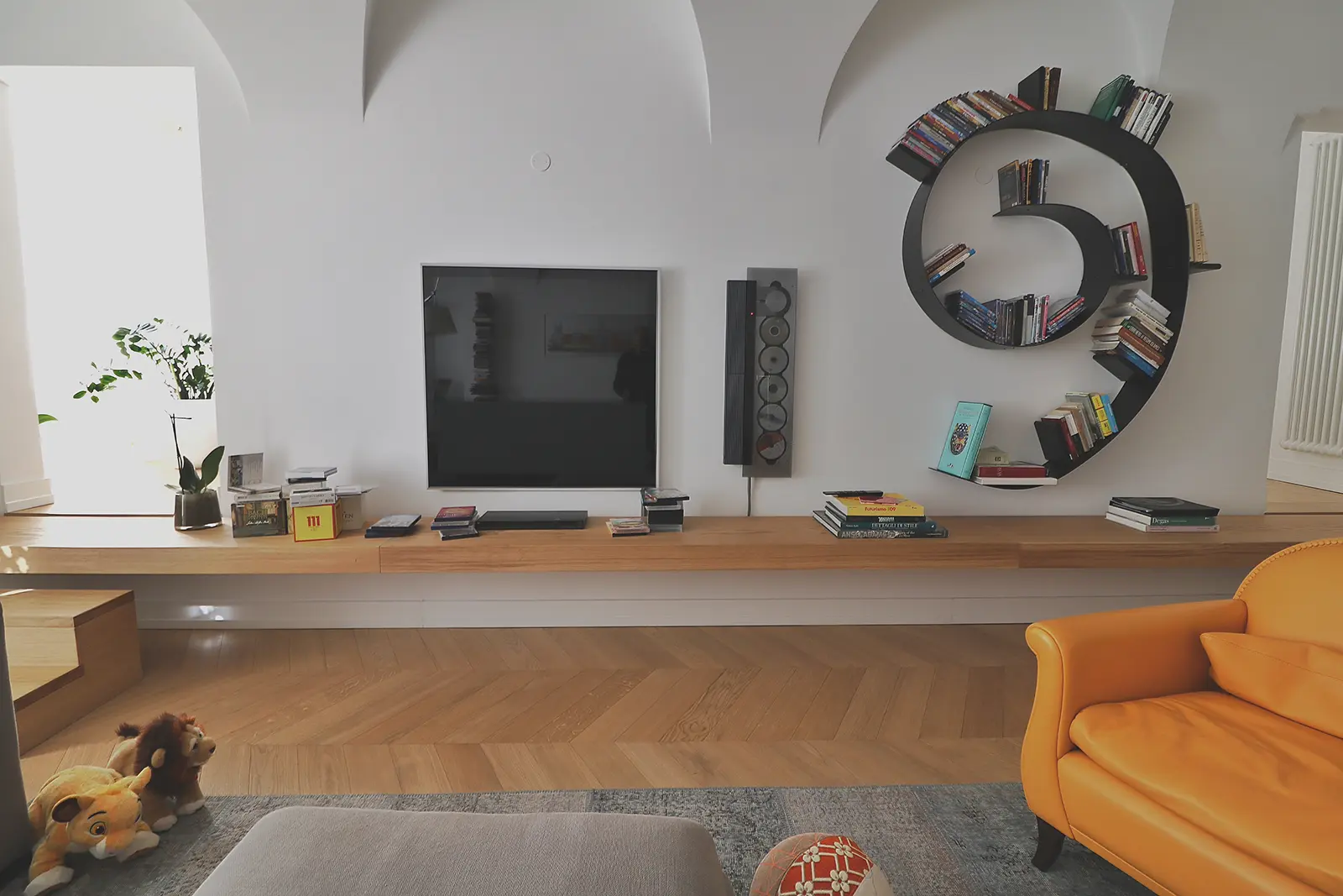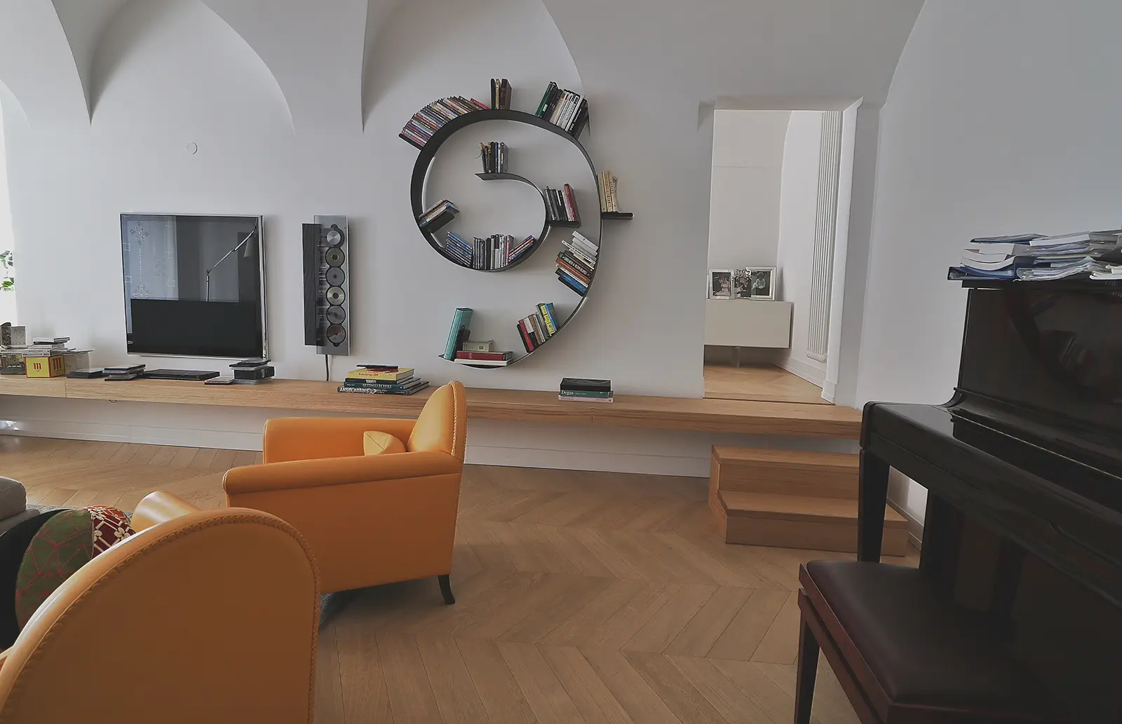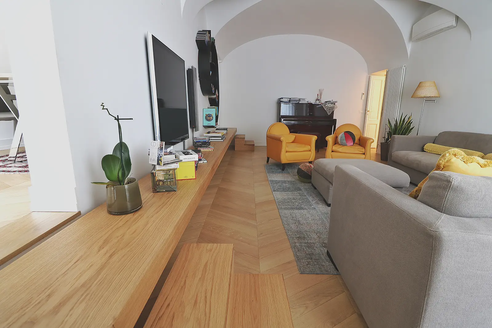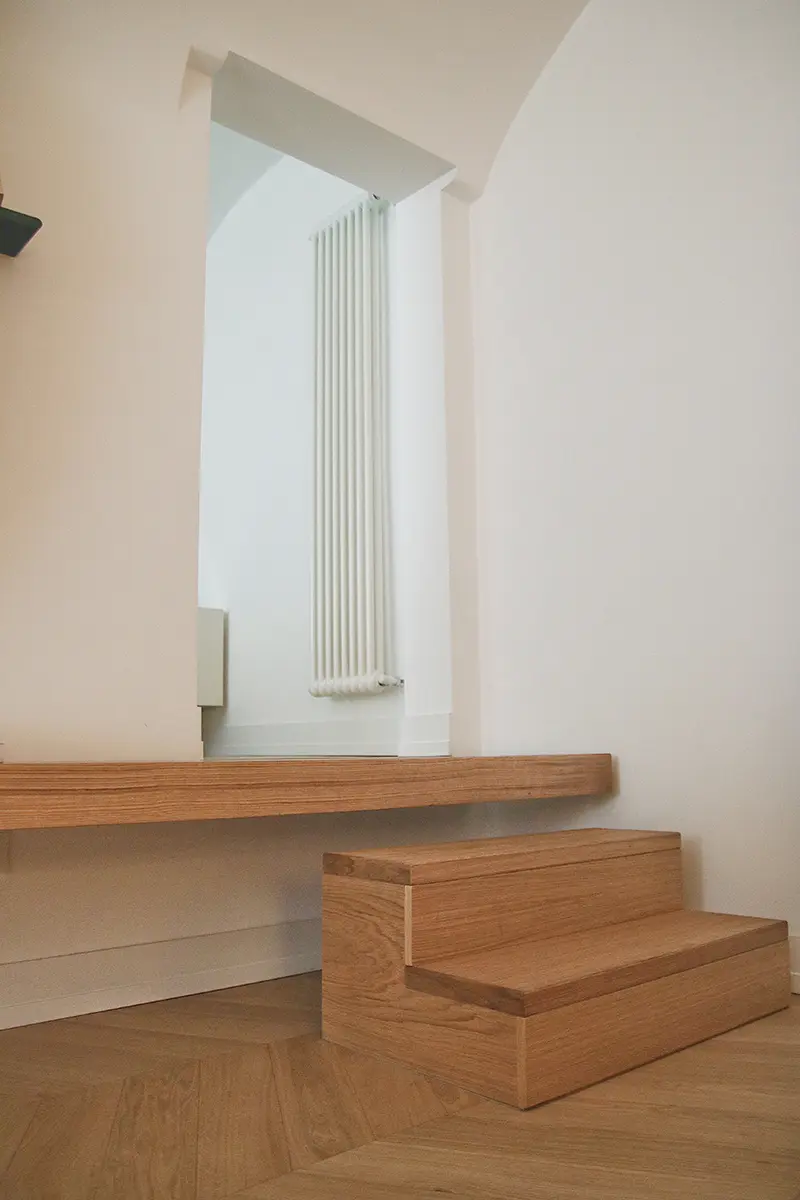 Un intervento semplice nel rispetto della configurazione originaria; il salotto prende spazio nella casa e un grande mensola enfatizza l’ingresso all’ambiente a botte più alto in cui il rapporto con la piazza acquista un rapporto privilegiato.