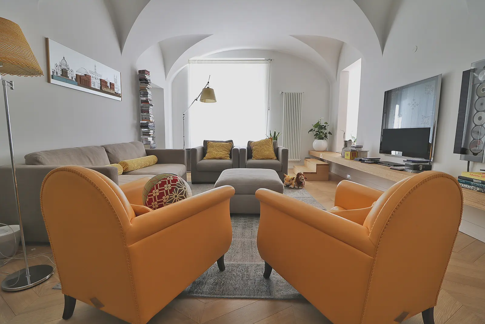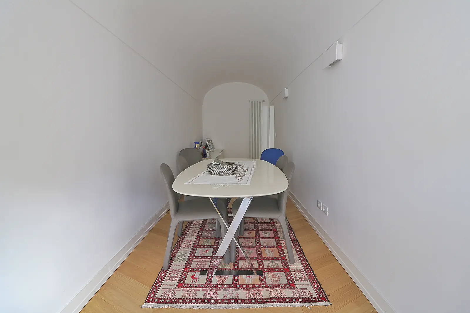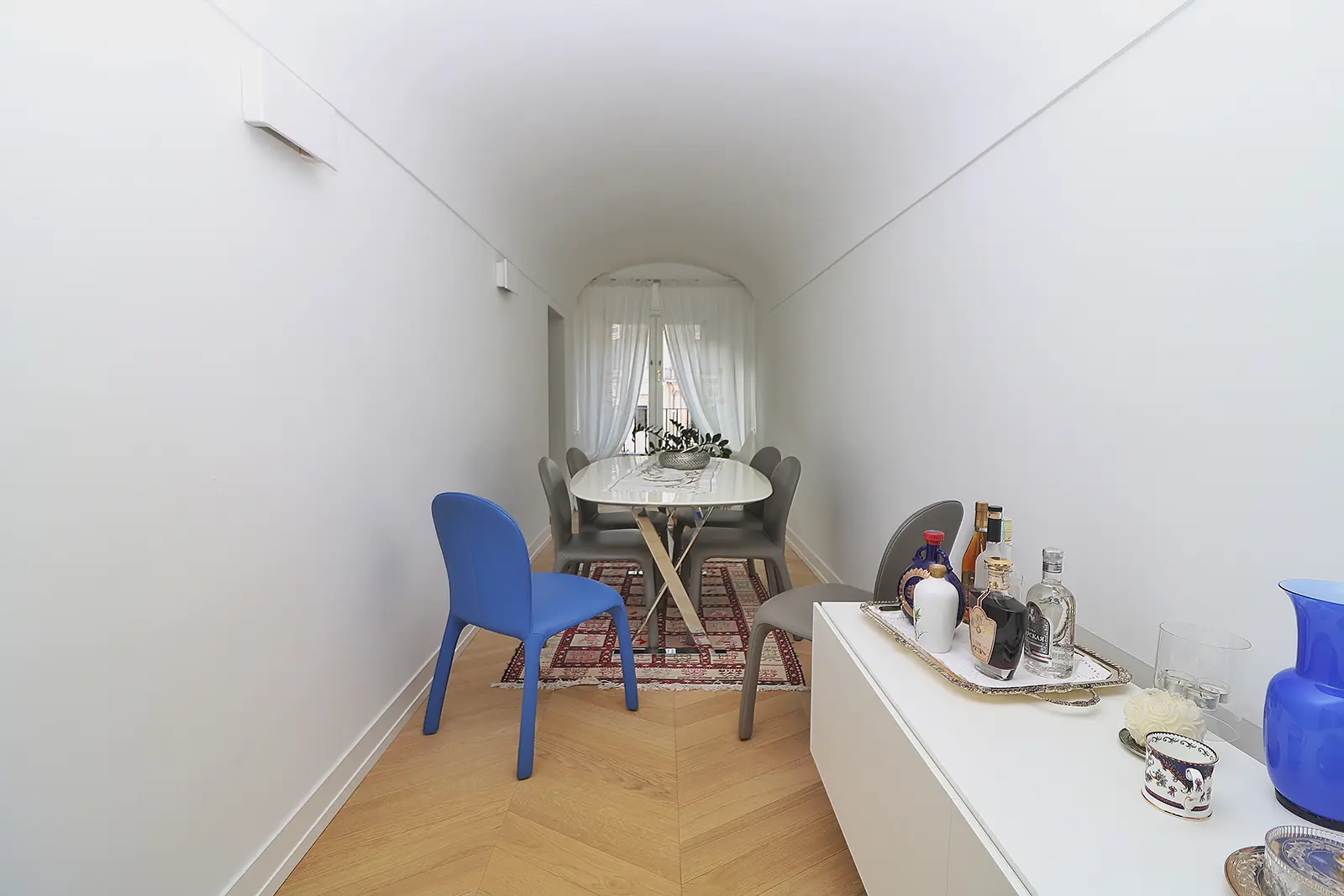 Un intervento semplice nel rispetto della configurazione originaria; il salotto prende spazio nella casa e un grande mensola enfatizza l’ingresso all’ambiente a botte più alto in cui il rapporto con la piazza acquista un rapporto privilegiato.