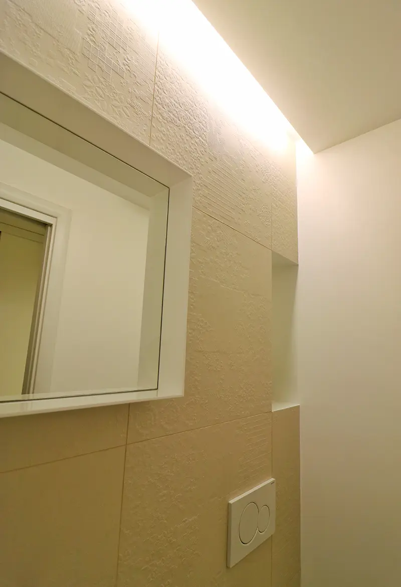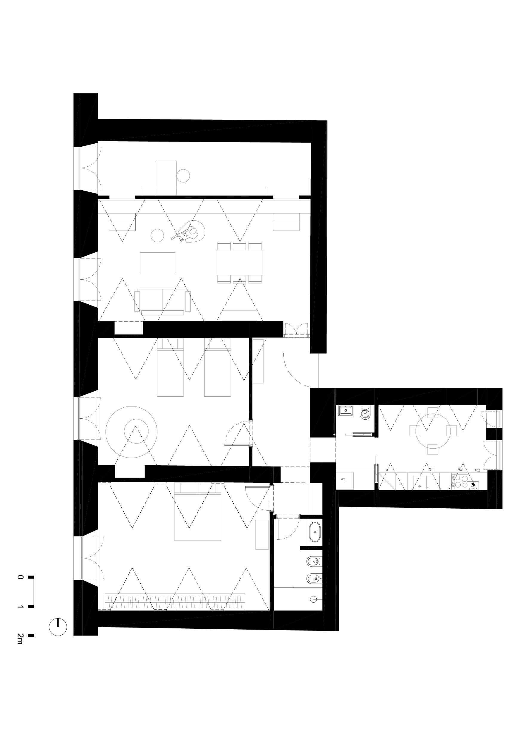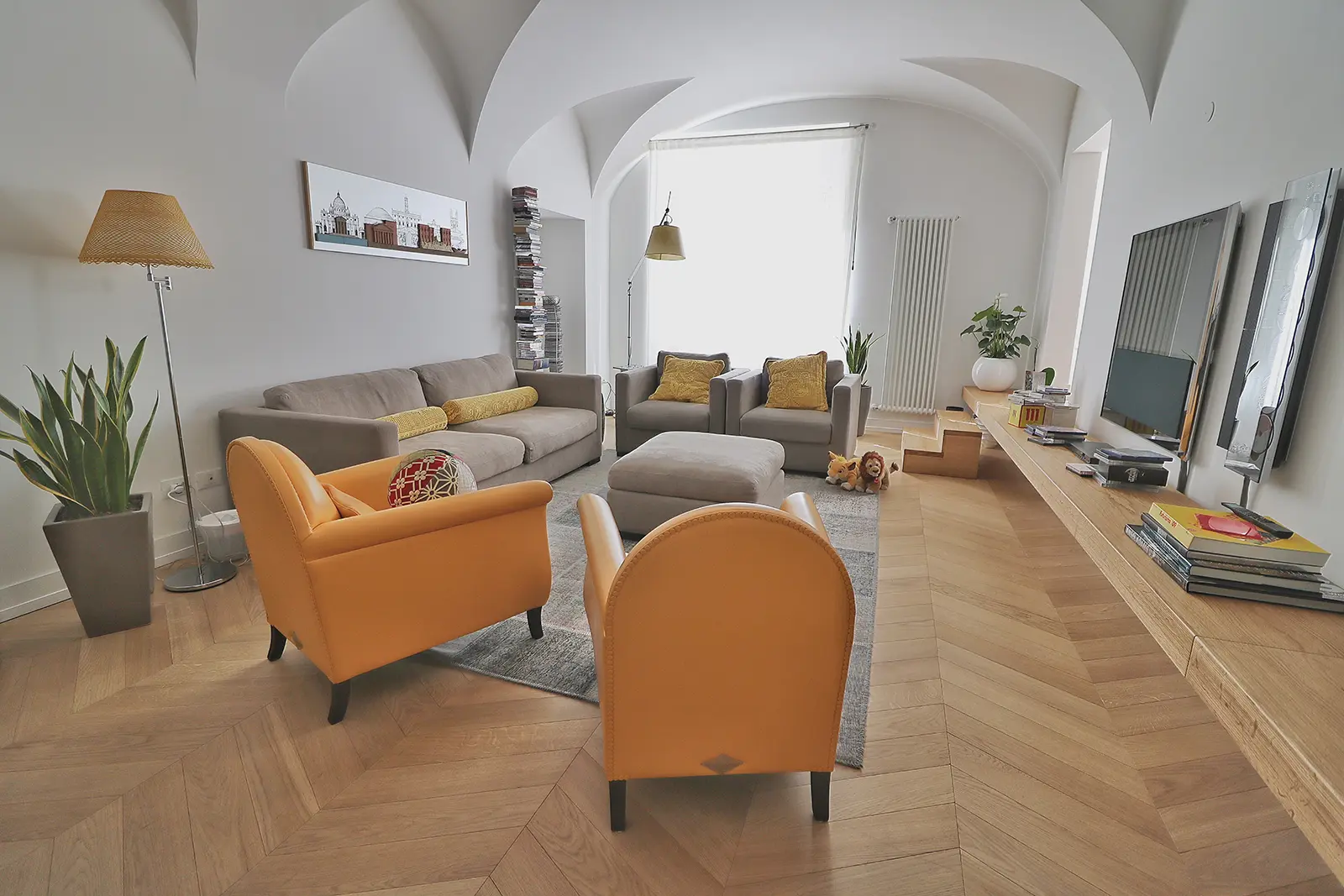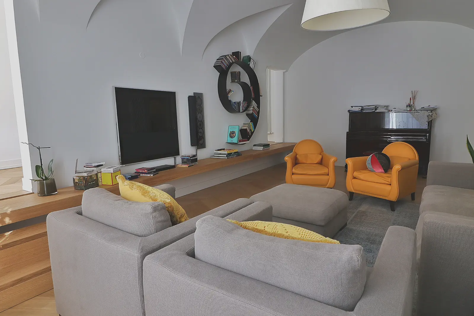 Un intervento semplice nel rispetto della configurazione originaria; il salotto prende spazio nella casa e un grande mensola enfatizza l’ingresso all’ambiente a botte più alto in cui il rapporto con la piazza acquista un rapporto privilegiato.